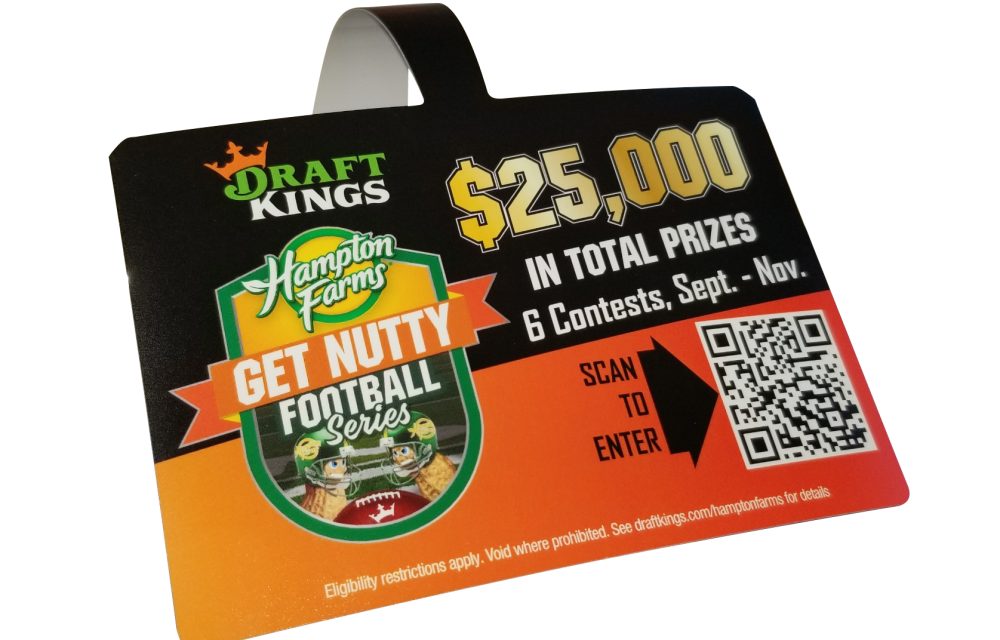 Draft Kings and Hampton Farms recently partnered for a “Get Nutty” football promotion where customers can win $25,000 in total prizes. To help promote this contest, Draft Kings and Hampton Farms decided an in-store wobbler would be a good method for generating interest and sharing information.